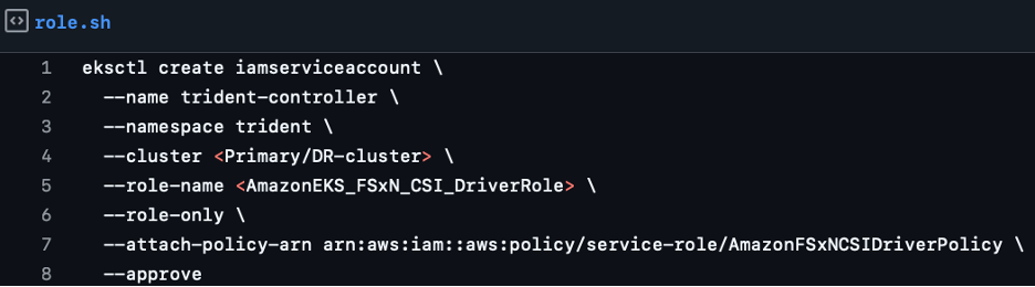 Chạy lệnh sau (như được hiển thị trong hình 6) để tạo vai trò IAM cho tài khoản dịch vụ với tên vai trò tùy chỉnh. Trong ví dụ này, đó là <AmazonEKS_FSxN_CSI_DriverRole>: