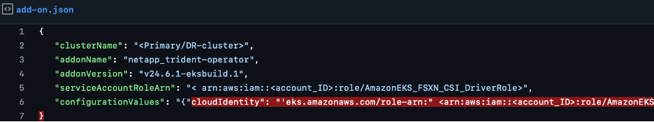 Tạo tệp add-on.json (như được hiển thị trong hình 7) để ghi lại các tham số thiết lập add-on. Cập nhật clusterName với tên cụm EKS chính và DR của bạn. Cập nhật serviceAccountRoleArn với Amazon Resource Name (ARN) của vai trò bạn, được tạo ở bước trước. Trong ví dụ này, ARN là <arn:aws:iam::<account_ID>:role/AmazonEKS_FSXN_CSI_DriverRole>. Cập nhật configurationValues với cùng ARN ở cuối giá trị chuỗi: