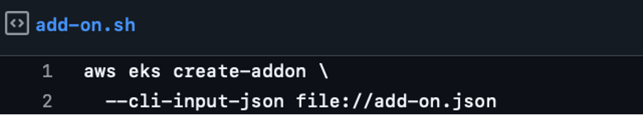 Hình 8: Lệnh AWS CLI để tạo EKS add-on sử dụng add-on.json làm tệp cấu hình
