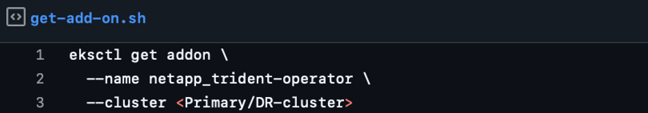 Xác minh trạng thái triển khai Trident add-on bằng cách kiểm tra phiên bản hiện tại thông qua lệnh eksctl (như được hiển thị trong hình 9). Thực hiện bước này trên cả hai cụm EKS chính và DR, thay thế primary/DR-Cluster bằng tên cụm tương ứng.