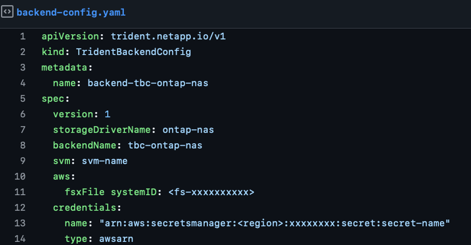 Tạo backend-config.yaml riêng biệt bằng cách sử dụng thông tin xác thực SVM (tên người dùng và mật khẩu) được lưu trữ trong AWS Secrets Manager, như đã đề cập trong điều kiện tiên quyết (mục về AWS Secrets Manager). Thực hiện điều này cho cả hai cụm EKS chính và DR cũng như các hệ thống tệp FSx for ONTAP tương ứng.