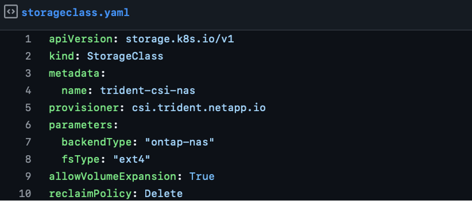 Hình 13: storageclass.yaml định nghĩa StorageClass sử dụng trình cấp phát NetApp Trident cho FSx ONTAP