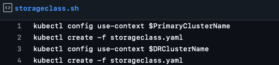 Sử dụng ví dụ storageclass.yaml sau (như được hiển thị trong hình 13), tạo các tệp YAML và chạy lệnh từ cả hai cụm EKS chính và DR: