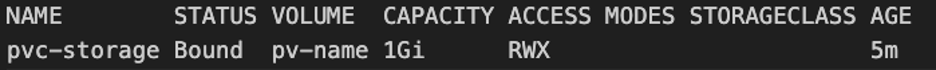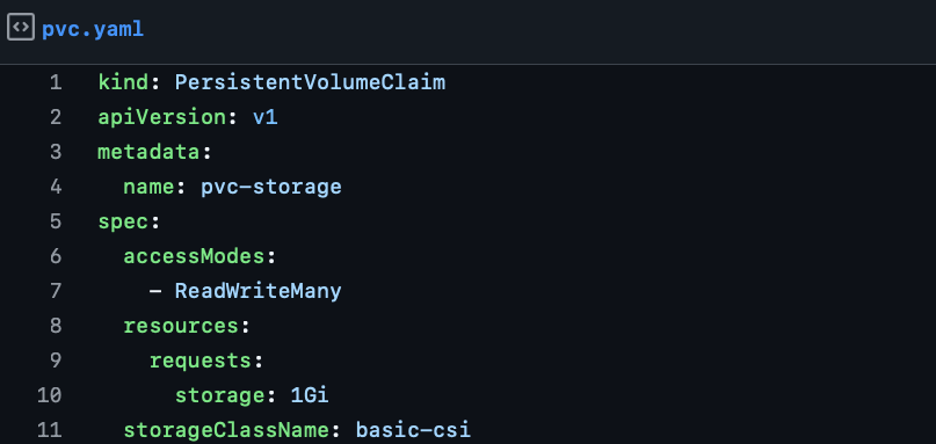 Hình 15: pvc.yaml định nghĩa một PVC với các cấu hình cơ bản bao gồm kích thước lưu trữ, quyền truy cập ReadWriteMany và lớp lưu trữ basic-csi