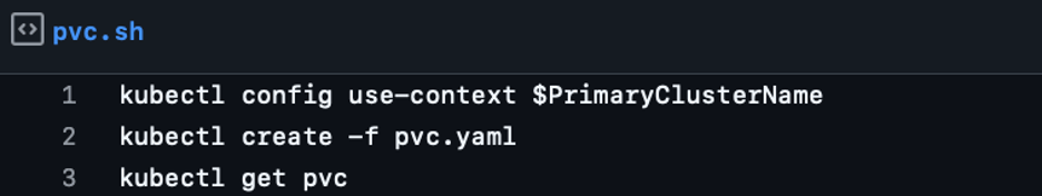 Hình 26: Các lệnh kubectl đặt ngữ cảnh, tạo PVC và xác minh trạng thái nhân bản