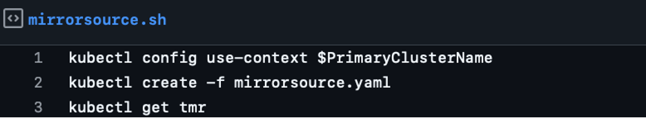 Hình 19: Các lệnh kubectl cấu hình mối quan hệ nhân bản Trident từ mirrorsource.yaml