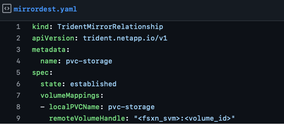 Tạo TMR trên cụm EKS DR bằng cách sử dụng manifest mirrordest.yaml (như được hiển thị trong hình 22). Đảm bảo bạn cập nhật tất cả localPVCName (chẳng hạn như pvc-storage, từ bước trước) và remoteVolumeHandle, chẳng hạn như ví dụ sau: