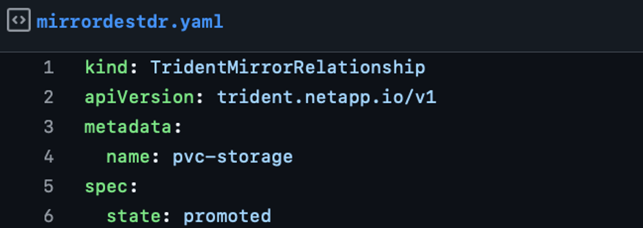 Sử dụng môi trường kiểm tra của bạn, bạn có thể dừng sao chép dữ liệu và nâng cấp (promote) PVC trên cụm EKS DR thành ReadWrite (cho phép đọc-ghi) và có thể gắn kết (mountable). Sử dụng manifest mirrordestdr.yaml sau làm ví dụ (như được hiển thị trong hình 28), bạn có thể thay đổi TMR từ “established” sang “promoted”, đó là những gì bạn cần để biến cụm Amazon EKS DR của bạn thành cụm chính.