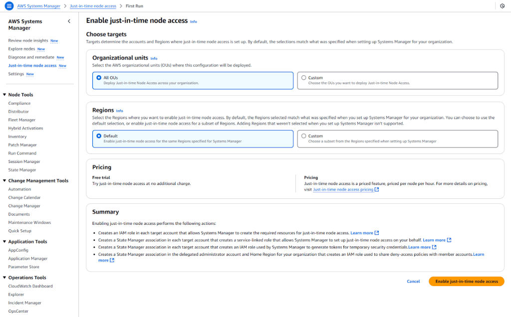 Systems Manager cung cấp một bản dùng thử miễn phí (free trial) cho just-in-time node access, cho phép bạn khám phá và đánh giá đầy đủ tính năng này cho tổ chức của mình.