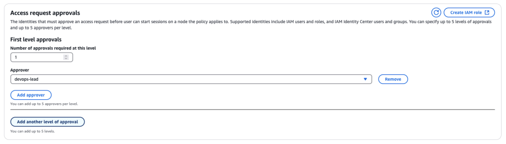 Trong mục Access request approvers, bạn sẽ chỉ định các cá nhân hoặc nhóm được ủy quyền để phê duyệt các yêu cầu truy cập. Trong kịch bản của chúng ta, chúng ta sẽ gán vai trò DevOps lead làm người phê duyệt. Người phê duyệt yêu cầu truy cập có thể là người dùng (user) và nhóm (group) của IAM Identity Center hoặc người dùng (user), nhóm (group), và vai trò (role) của IAM như trong hình 5.