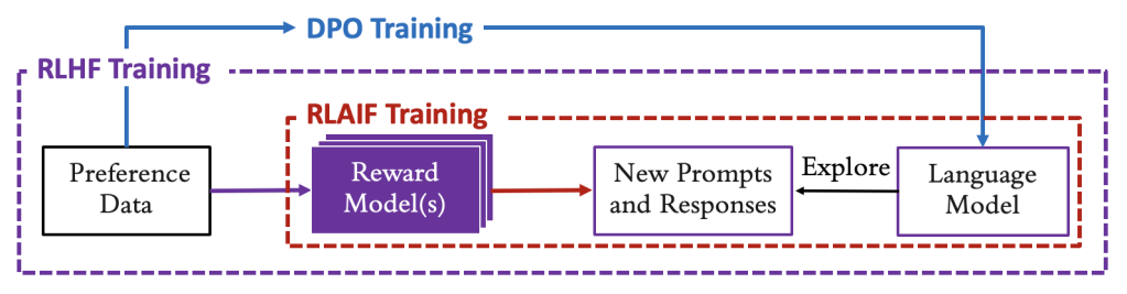 Sơ đồ sau minh họa quá trình học từ phản hồi sở thích trực tiếp bằng tối ưu hóa chính sách (DPO) so với với một reward model để khám phá và chấm điểm các phản hồi mới bằng tối ưu hóa chính sách cận biên (proximal policy optimization – PPO) của RLHF/RLAIF.