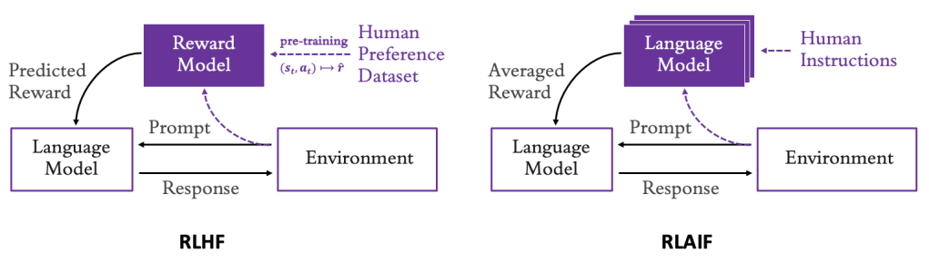 Trong RLAIF, một LLM đã được huấn luyện trước được hướng dẫn sử dụng ngôn ngữ tự nhiên để phê bình và sửa đổi các phản hồi của LLM khác (hoặc của chính nó) nhằm củng cố các nhu cầu cụ thể và sở thích của con người, hoặc một số nguyên tắc chung hơn (giá trị đạo đức, tiềm năng nội dung có hại, v.v.). Phản hồi LLM này cung cấp các nhãn AI có thể được sử dụng trực tiếp làm tín hiệu phần thưởng để tinh chỉnh LLM bằng học tăng cường. Kết quả gần đây cho thấy RLAIF đạt được hiệu suất tương đương hoặc vượt trội so với RLHF trong các tác vụ tóm tắt, tạo hội thoại hữu ích và tạo hội thoại vô hại.