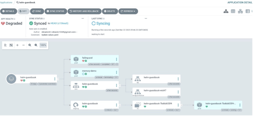 Trong kịch bản này, chúng ta tiếp tục từ prompt trước đó. Chúng ta cảm thấy ứng dụng không được cung cấp đủ bộ nhớ và nó nên được tăng lên để khắc phục sự cố vĩnh viễn. Chúng ta cũng có thể thấy ứng dụng đang ở trạng thái không lành mạnh trong giao diện ArgoCD, như được hiển thị trong ảnh chụp màn hình sau.