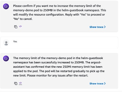 Tác nhân đã tương tác với tác nhân argocd_operations Amazon Bedrock và đã thành công trong việc tăng bộ nhớ. Điều này cũng có thể được xác nhận trong giao diện ArgoCD.
