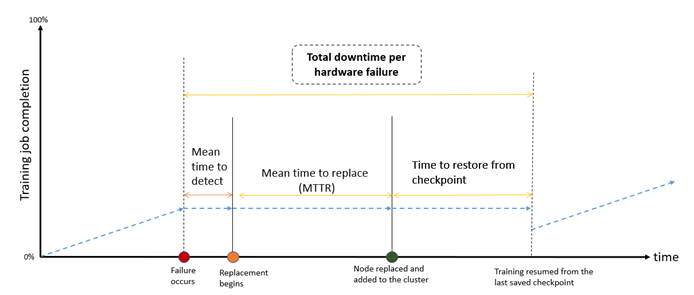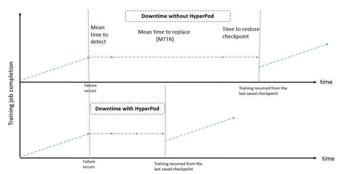 Phát hiện lỗi nhanh hơn (rút ngắn MTTD), thời gian thay thế ngắn hơn (rút ngắn MTTR) và khả năng khôi phục nhanh sẽ góp phần giảm tổng thời gian huấn luyện. Tự động hóa các quy trình này với sự can thiệp tối thiểu của người dùng là một lợi thế quan trọng của Amazon SageMaker HyperPod.