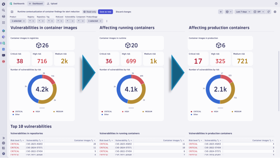Hơn nữa, số lượng lớn các phát hiện bảo mật có thể khiến các nhóm DevSecOps bị quá tải, dẫn đến việc bỏ sót những vấn đề thực sự quan trọng có ảnh hưởng trực tiếp đến các dịch vụ và ứng dụng đang chạy trong môi trường sản xuất. Một ví dụ điển hình là lỗ hổng có mức độ nghiêm trọng cao được phát hiện trong một tạo phẩm ở giai đoạn build (build-time artifact), chẳng hạn như một container image chưa được triển khai và do đó không ảnh hưởng đến runtime. Những phát hiện dạng này không nên làm phân tán sự chú ý của nhóm DevSecOps. Thay vào đó, họ cần tập trung vào những lỗ hổng tồn tại trong các ứng dụng đang chạy trên môi trường sản xuất, vốn được phơi bày trực tiếp ra internet và mang lại rủi ro thực sự.