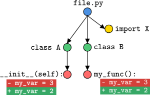 Trong Hình 2, chúng ta thấy một thay đổi ở node lớp (class node) A được thể hiện bằng một thay đổi trong hàm khởi tạo (initialization function) của nó trên đường dẫn bên trái bắt đầu từ node tệp (file node). Ngược lại với thay đổi đầu tiên, thay đổi trong lớp B được coi là một thay đổi node hàm (function node change) vì nó không ảnh hưởng đến việc khởi tạo (construction) lớp.