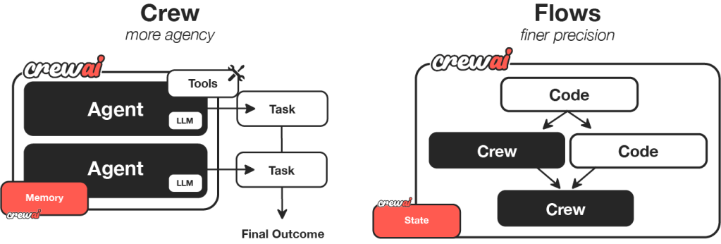 Luồng CrewAI (CrewAI Flows) cung cấp một khuôn khổ có cấu trúc, hướng sự kiện (event-driven framework) để điều phối các tự động hóa AI đa bước (multi-step AI automations) phức tạp một cách liền mạch. Các luồng cho phép người dùng xác định các quy trình công việc tinh vi kết hợp mã thông thường, các lệnh gọi mô hình ngôn ngữ lớn đơn lẻ (single LLM calls) và có khả năng là nhiều tổ đội, thông qua logic điều kiện (conditional logic), vòng lặp (loops) và quản lý trạng thái thời gian thực (real-time state management). Tính linh hoạt này cho phép các doanh nghiệp xây dựng các quy trình tự động hóa thông minh, động (dynamic, intelligent automation pipelines) thích ứng với các điều kiện thay đổi và nhu cầu kinh doanh đang phát triển. Hình sau minh họa sự khác biệt giữa Tổ đội (Crews) và Luồng (Flows):