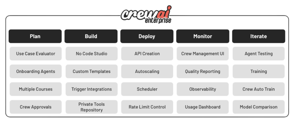 Đối với các doanh nghiệp đang tìm kiếm các giải pháp AI Agent được tùy chỉnh, CrewAI cung cấp một sản phẩm doanh nghiệp bao gồm hỗ trợ chuyên dụng, tùy chỉnh nâng cao và tích hợp với các hệ thống cấp doanh nghiệp như Amazon Bedrock. Điều này cho phép các tổ chức triển khai các AI Agent ở quy mô lớn trong khi vẫn duy trì các yêu cầu về bảo mật và tuân thủ (security and compliance).