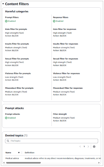 Amazon Bedrock Guardrails là can thiệp khi chạy mô hình giúp triển khai bảo vệ bằng cách đánh giá nội dung dựa trên các quy tắc xác thực định trước. Bạn có thể tạo rào chắn bảo vệ tùy chỉnh để phát hiện và bảo vệ thông tin nhạy cảm như PII, lọc nội dung không phù hợp, ngăn chặn prompt injection, và xác minh phản hồi tuân thủ chính sách và yêu cầu tuân thủ. Một ví dụ về rào chắn bảo vệ tùy chỉnh lọc nội dung độc hại, tấn công prompt, và từ chối chủ đề y tế có thể thấy trong Hình 1.