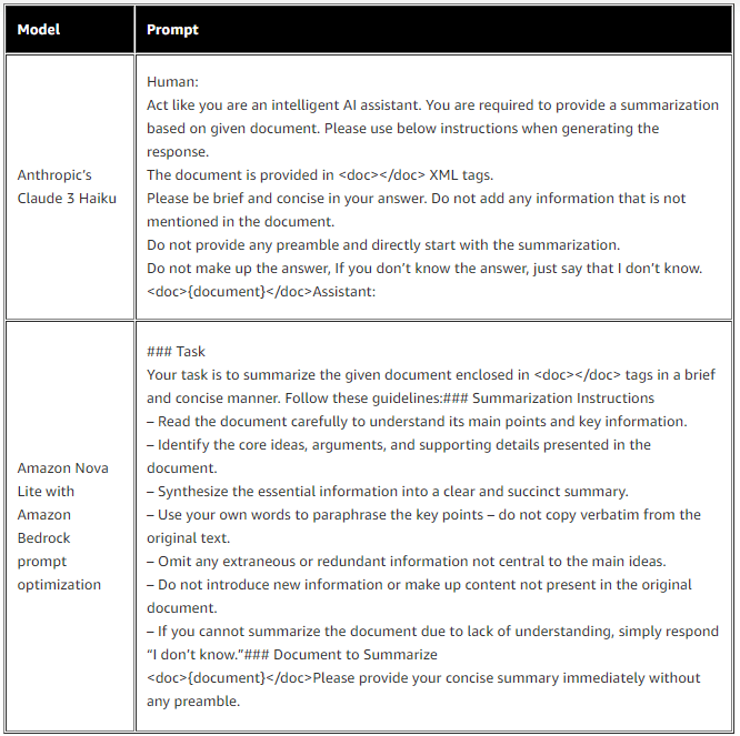 Ở bước đầu tiên, bạn có thể sử dụng tính năng tối ưu hóa prompt để điều chỉnh prompt của mình cho phù hợp với Amazon Nova. Bằng cách phân tích prompt bạn cung cấp, tính năng này diễn giải nhiệm vụ, prompt hệ thống và hướng dẫn trong prompt, sau đó tự động tạo lại prompt với định dạng riêng cho Amazon Nova cùng các từ, cụm từ và câu phù hợp. Ví dụ sau đây minh họa cách mà tính năng tối ưu hóa prompt chuyển đổi một prompt thông thường cho tác vụ tóm tắt trên Claude Haiku của Anthropic thành một prompt có cấu trúc chặt chẽ cho mô hình Amazon Nova, với các phần bắt đầu bằng các thẻ markdown đặc biệt như ## Task, ### Summarization Instructions, và ### Document to Summarize.