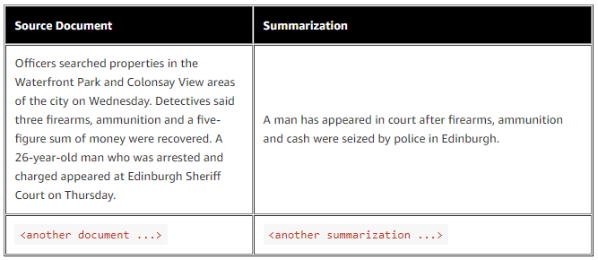 Tối ưu hóa dựa trên dữ liệu nhận các đầu vào. Đầu vào thứ nhất là các chỉ số mục tiêu tối ưu hóa do người dùng xác định; đối với tác vụ tóm tắt được đề cập trong phần trước, bạn có thể sử dụng điểm BERT-F1 hoặc tự tạo một LLM judge của riêng mình. Đầu vào thứ hai là bộ dữ liệu huấn luyện (DevSet) do người dùng cung cấp để xác thực chất lượng phản hồi, ví dụ như một mẫu dữ liệu tóm tắt có định dạng như sau.