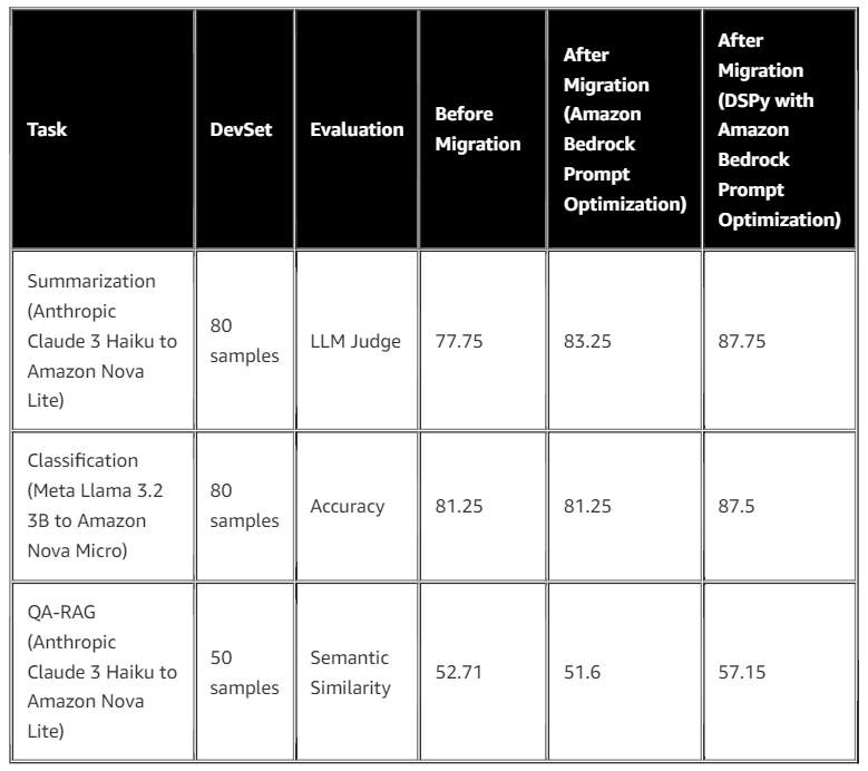 Chúng tôi cũng đã áp dụng quy trình tối ưu hóa này trên các tác vụ LLM khác, bao gồm tác vụ phân loại văn bản đa lớp (multi-class text classification) và tác vụ hỏi-đáp (question-answering) sử dụng RAG. Trong tất cả các tác vụ, phương pháp của chúng tôi đã tối ưu hóa mô hình Amazon Nova sau khi di chuyển, giúp nó vượt trội so với các mô hình Anthropic Claude Haiku và Meta Llama trước khi di chuyển. Bảng và biểu đồ dưới đây minh họa kết quả tối ưu hóa.