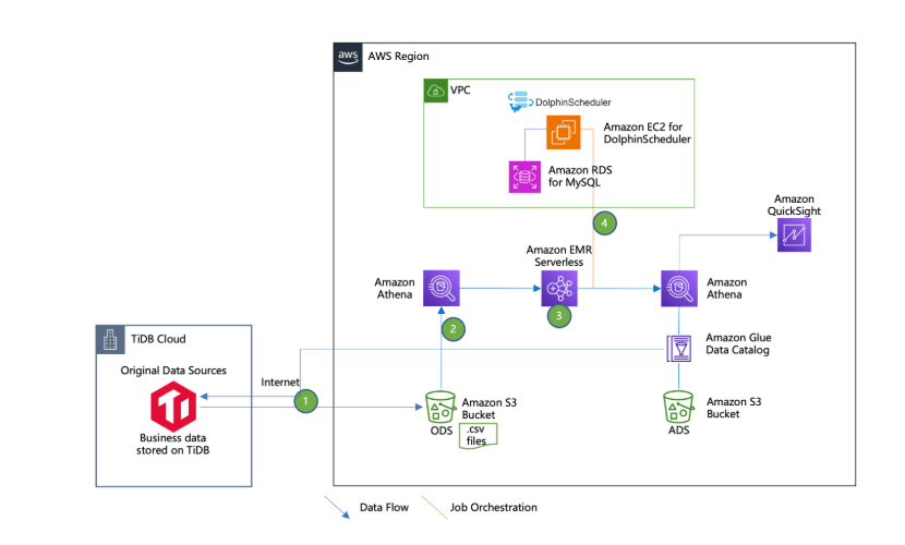 Bài viết này thảo luận về một phương pháp tách rời trong việc xây dựng một serverless data lakehouse bằng cách sử dụng các dịch vụ tập trung vào đám mây của AWS, bao gồm Amazon EMR Serverless, Amazon Athena, Amazon Simple Storage Service (Amazon S3), Apache DolphinScheduler (một open source data job scheduler), cũng như PingCAP TiDB, một sản phẩm data warehouse của bên thứ ba có thể được triển khai trên on-premises hoặc trên đám mây thông qua mô hình phần mềm dưới dạng dịch vụ (SaaS).