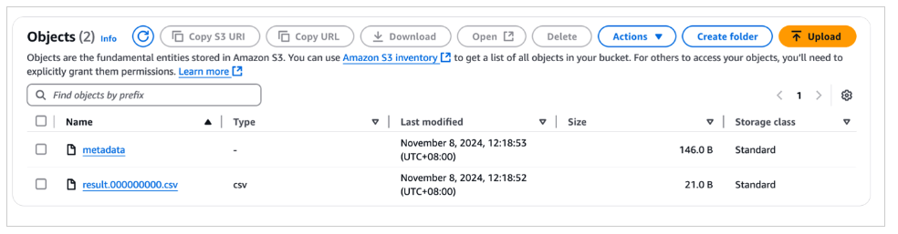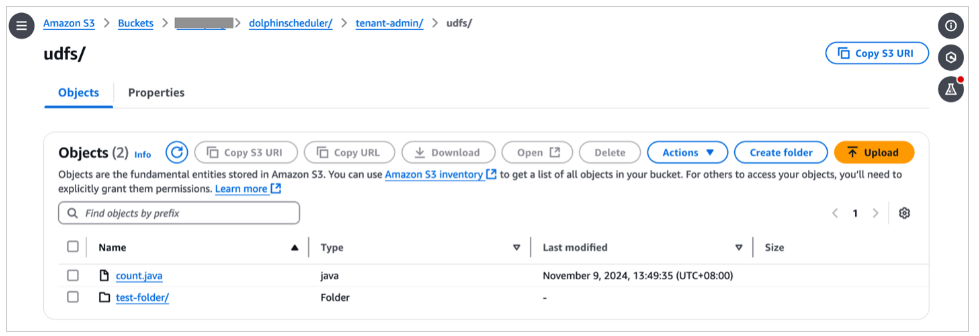 Bạn có thể xác thực xem việc chuyển lớp lưu trữ sang Amazon S3 có thành công hay không bằng cách tải lên tập lệnh bằng Bảng điều khiển Trung tâm tài nguyên DolphinScheduler, kiểm tra xem tệp có xuất hiện trong thư mục vùng lưu trữ S3 có liên quan hay không.