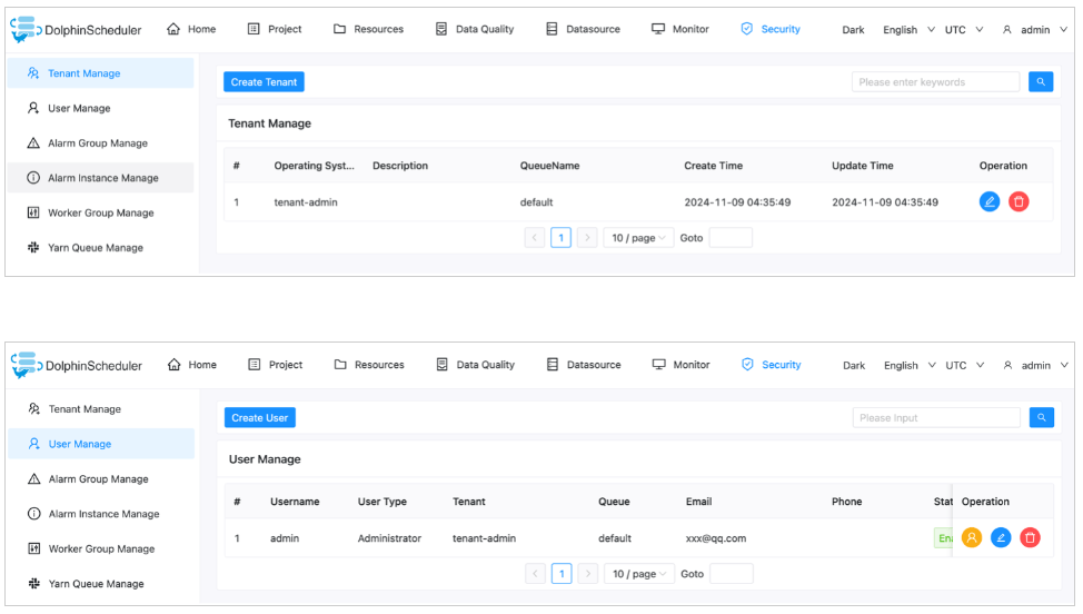 Trước khi xác minh rằng Amazon S3 hiện là vị trí lưu trữ của DolphinScheduler, bạn cần tạo một tenant trên bảng điều khiển DolphinScheduler và liên kết người dùng quản trị với tenant đó, như minh họa trong ảnh chụp màn hình sau: