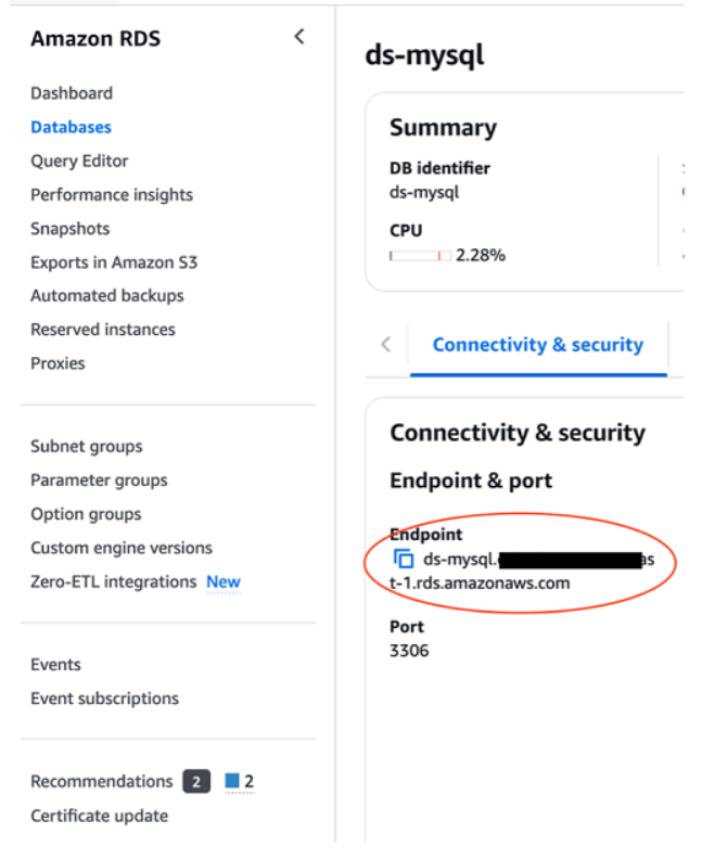 8. Điều hướng đến trang chi tiết cơ sở dữ liệu ds- mysql và trong Connectivity & security, sao chép endpoint RDS cho MySQL.
