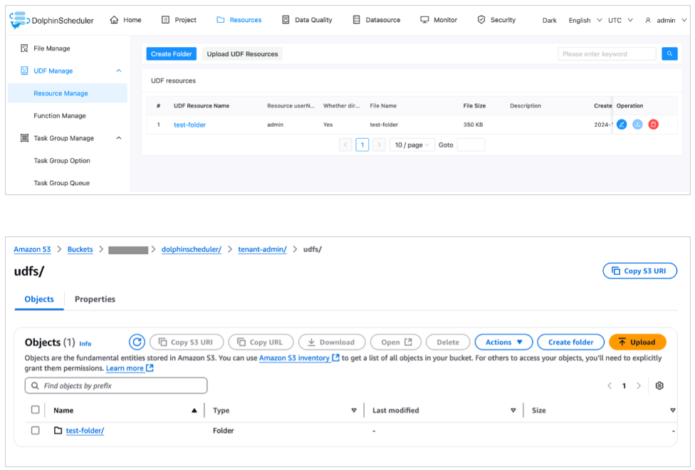 Sau đó, bạn có thể tạo một thư mục trên bảng điều khiển DolphinScheduler và kiểm tra xem thư mục có hiển thị trên bảng điều khiển Amazon S3 hay không.