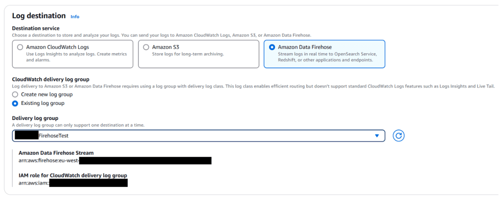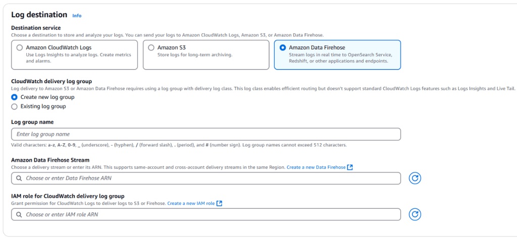 - Trong phần “Log destination“, chọn Amazon S3 hoặc Amazon Data Firehose. Amazon CloudWatch Logs là lựa chọn mặc định.