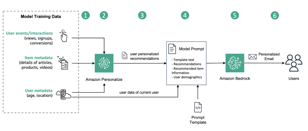 Generate user-personalized communication with Amazon Personalize and Amazon Bedrock — Amazon Personalize và Amazon Bedrock hợp tác để tạo ra các email marketing được cá nhân hóa. Tìm hiểu cách tạo các thông điệp cá nhân hóa cho người dùng bằng cách kết hợp Amazon Personalize để đề xuất phim với Amazon Bedrock để tạo nội dung email phù hợp dựa trên sở thích và đặc điểm người dùng.