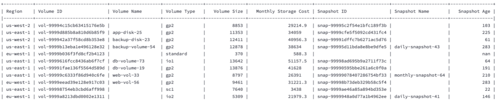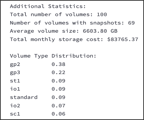 df['Monthly Storage Cost'] = df.apply(lambda row: row['Volume Size'] * random.uniform(0.05, 0.15) * (1.5 if row['Volume Type'] in ['io1', 'io2'] else 1), axis=1).round(2)