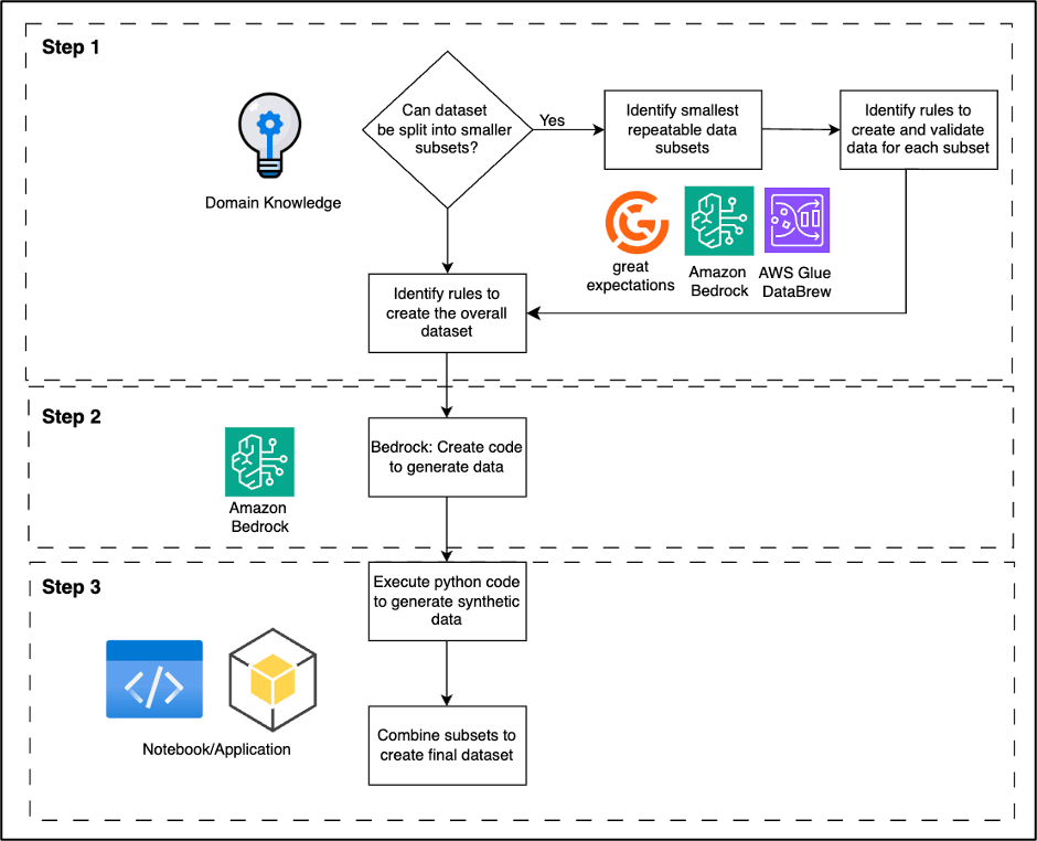 - Sử dụng các quy tắc đó để tạo code bằng Amazon Bedrock nhằm tạo các synthetic data subsets.