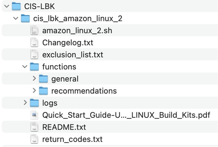 Thư mục chính chứa file amazon_linux_2.sh — script chính gọi các script phụ trong thư mục “functions”. Nếu bạn muốn loại trừ một số khuyến nghị, hãy thêm chúng vào file exclusion_list.txt.