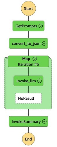 - convert_to_json – Bước này phân tích (parse) output CSV và chuyển đổi nó sang định dạng JSON. Quá trình chuyển đổi này cho phép Step Function sử dụng Map state để xử lý invoke_llm flow đồng thời (concurrently).