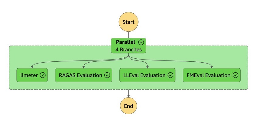 Việc invoking batch evaluation sẽ kích hoạt một workflow Evaluate-LLM Step Functions, được minh họa trong hình dưới đây. Workflow Evaluate-LLM Step Functions được thiết kế để đánh giá toàn diện hiệu suất của LLM bằng cách sử dụng nhiều evaluation frameworks: