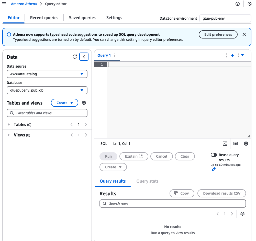 - Bây giờ bạn sẽ được tự động chuyển đến console Athena, đảm bảo rằng Amazon DataZone Environment được đặt thành glue_subscribe_environment.