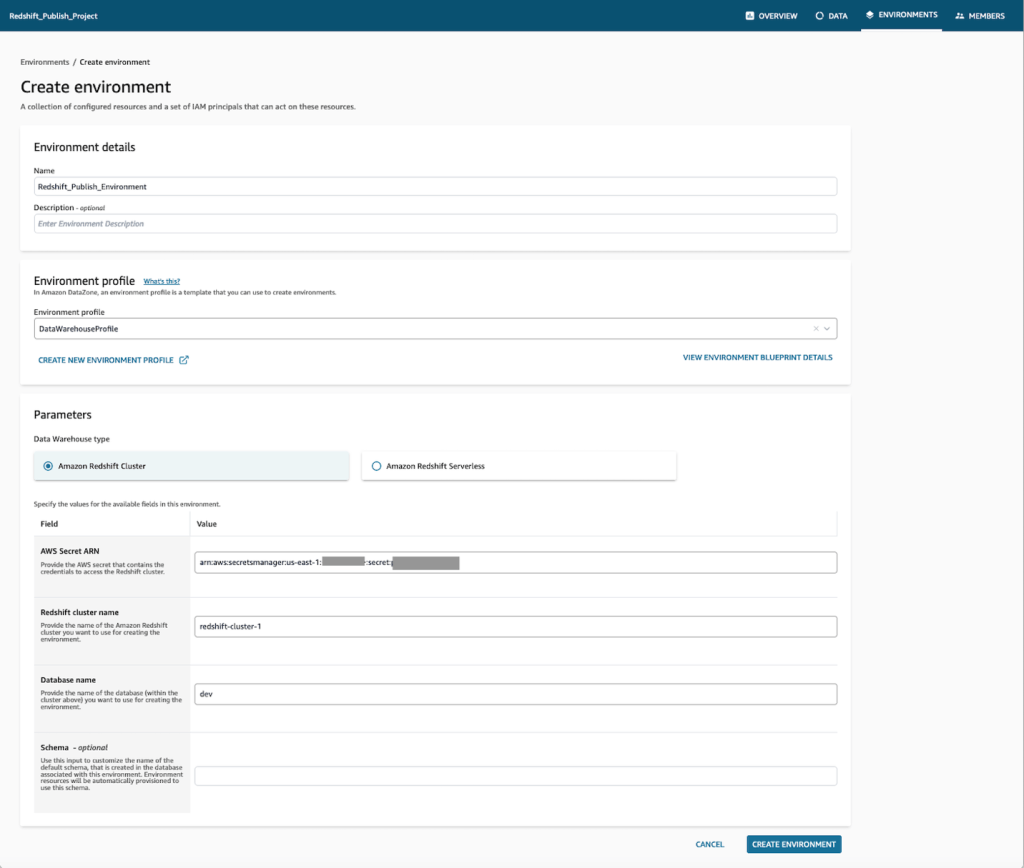 b. Xác minh rằng Environment profile được đặt thành redshift_subscribe-env-profile. - Chọn Create Environment.