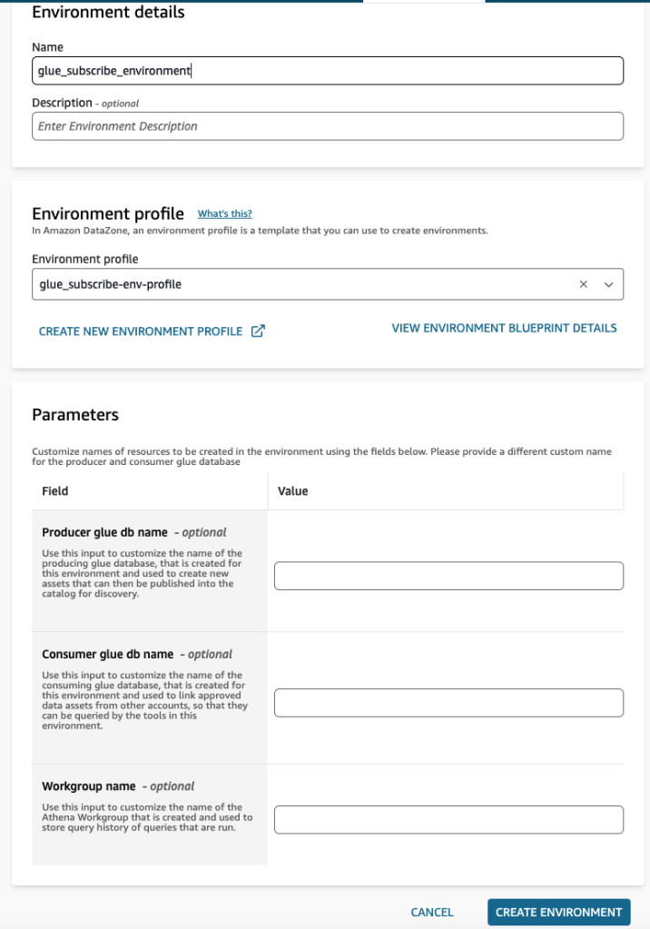 b. Xác minh rằng Environment profile được đặt thành glue_subscribe-env-profile. - (Tùy chọn) Parameters: Nhập Producer glue db name, Consumer glue db name, và Workgroup name.