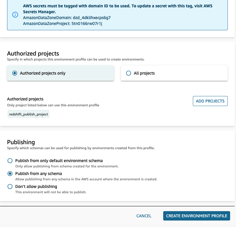 - Tiếp tục trong cùng miền Amazon DataZone demo_cross_account_domain, chọn Browse Project, để tạo môi trường xuất bản Amazon Redshift, chọn Redshift_Publish_Project và tạo Redshift_Publish_Environment bằng cách sử dụng hồ sơ data warehouse mặc định.