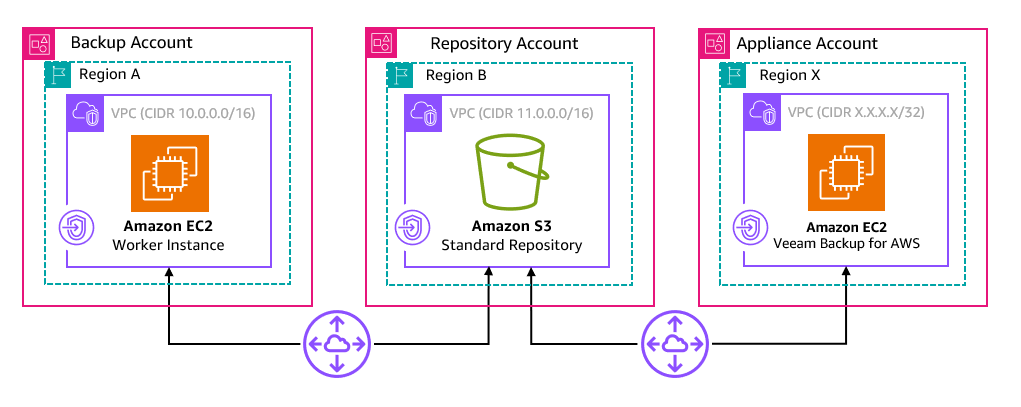 Việc có các bản sao lưu và snapshot được mã hóa trong một tài khoản và Region riêng biệt cho phép khách hàng tuân theo best practice trong data protection. Veeam tự động triển khai các worker instance trong tài khoản production hoặc backup và loại bỏ chúng ngay sau khi quá trình khôi phục và sao lưu hoàn tất. Chúng có thể được triển khai riêng biệt khỏi Appliance accounts nơi Veeam Backup for AWS được cài đặt và Backup Repository accounts nơi dữ liệu sao lưu được lưu trữ trong Amazon S3.