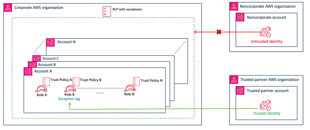 Khi triển khai kiểm soát bằng RCP mà theo mặc định sẽ áp dụng cho tất cả các tài nguyên của thực thể mà nó được đính kèm, bạn có thể quản lý các ngoại lệ cụ thể của tài nguyên bằng cách sử dụng khóa điều kiện aws:ResourceTag. Ngoài ra, hãy sử dụng khóa ngữ cảnh aws:PrincipalAccount để cấp ngoại lệ có điều kiện dựa trên ID tài khoản AWS của đối tác đáng tin cậy.