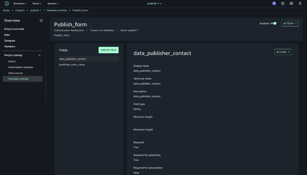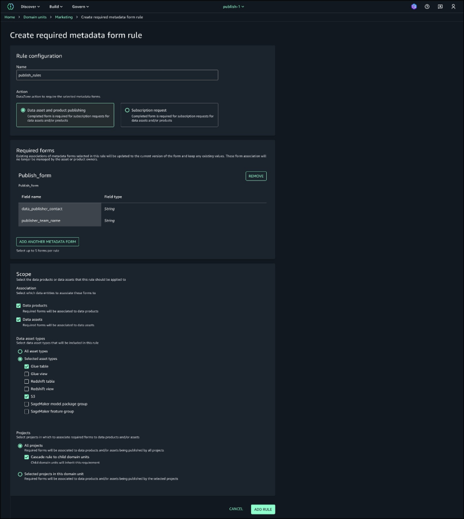 Trong bài viết này, chúng tôi hướng dẫn bạn qua hai workflow: thiết lập các quy tắc thực thi metadata cho một domain cụ thể và xuất bản một asset hoặc data product trong một catalog, và thiết lập các quy tắc thực thi metadata cho một domain cụ thể và đăng ký một asset hoặc data product thuộc sở hữu của một project trong domain đó.