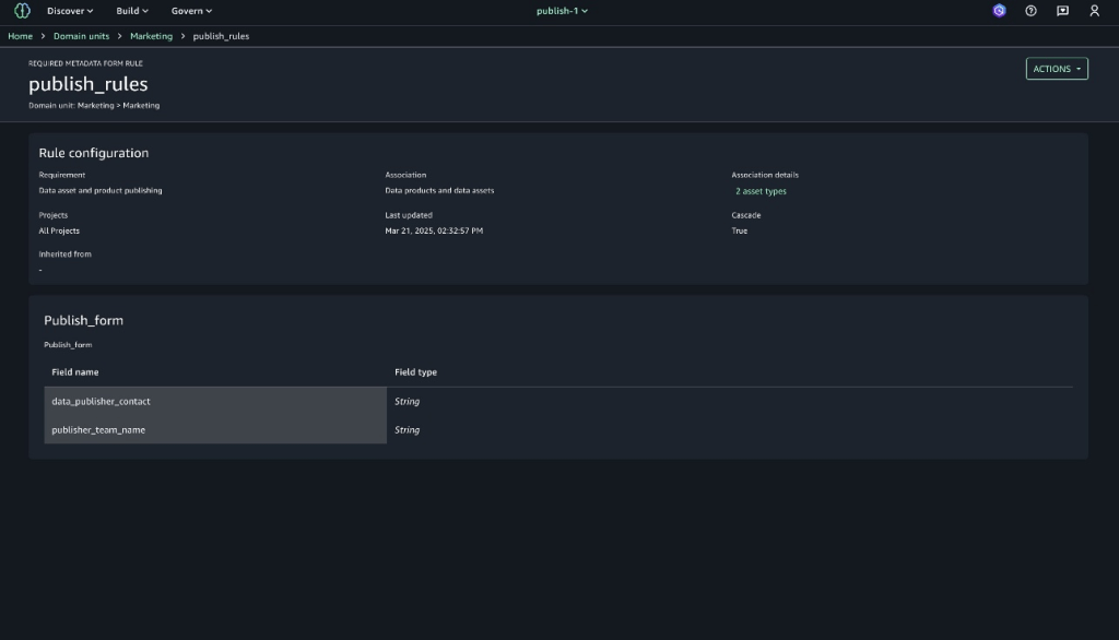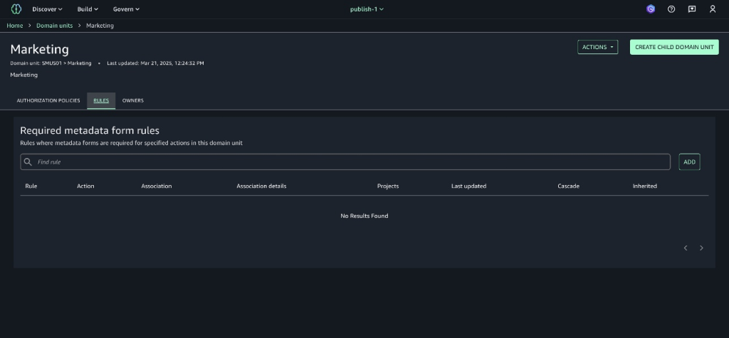Trong phần này, chúng tôi sẽ chỉ cho bạn cách thiết lập các quy tắc metadata cho một domain cụ thể với tư cách là domain admin. Chúng tôi cũng giải thích điều gì xảy ra khi bạn xuất bản một asset hoặc data product trong một catalog với các quy tắc này được áp dụng.