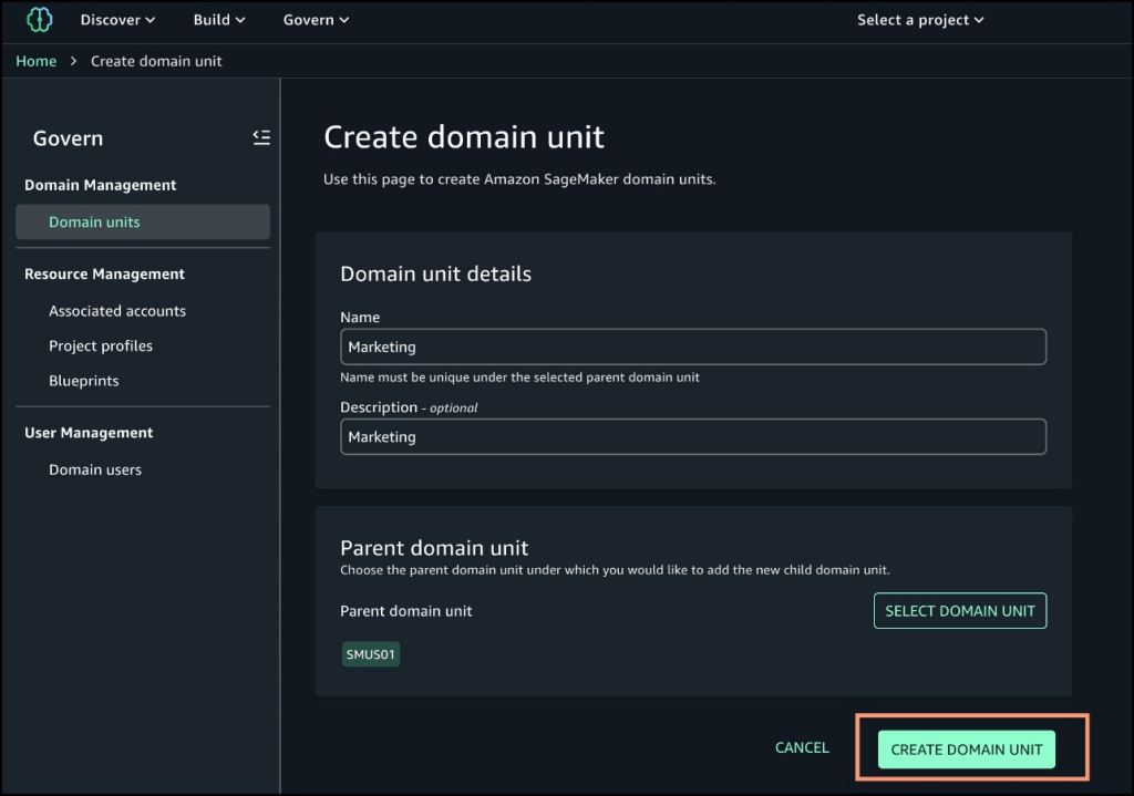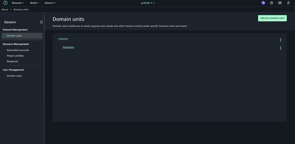 - Trên console SageMaker Unified Studio, chọn menu thả xuống Govern và chọn Domain units.