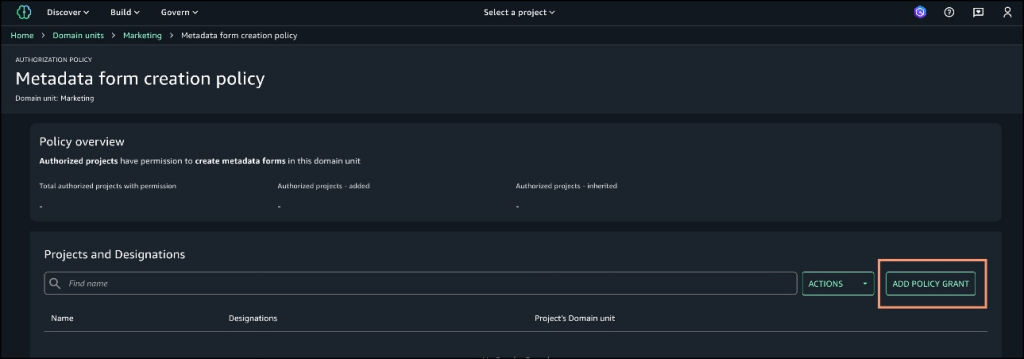 - Điều hướng đến tab AUTHORIZATION POLICIES trong domain unit Marketing và chọn Metadata form creation policy.