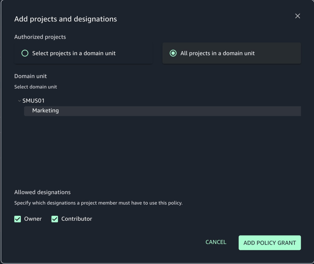 - Chọn All projects in a domain unit và thêm một policy grant.
